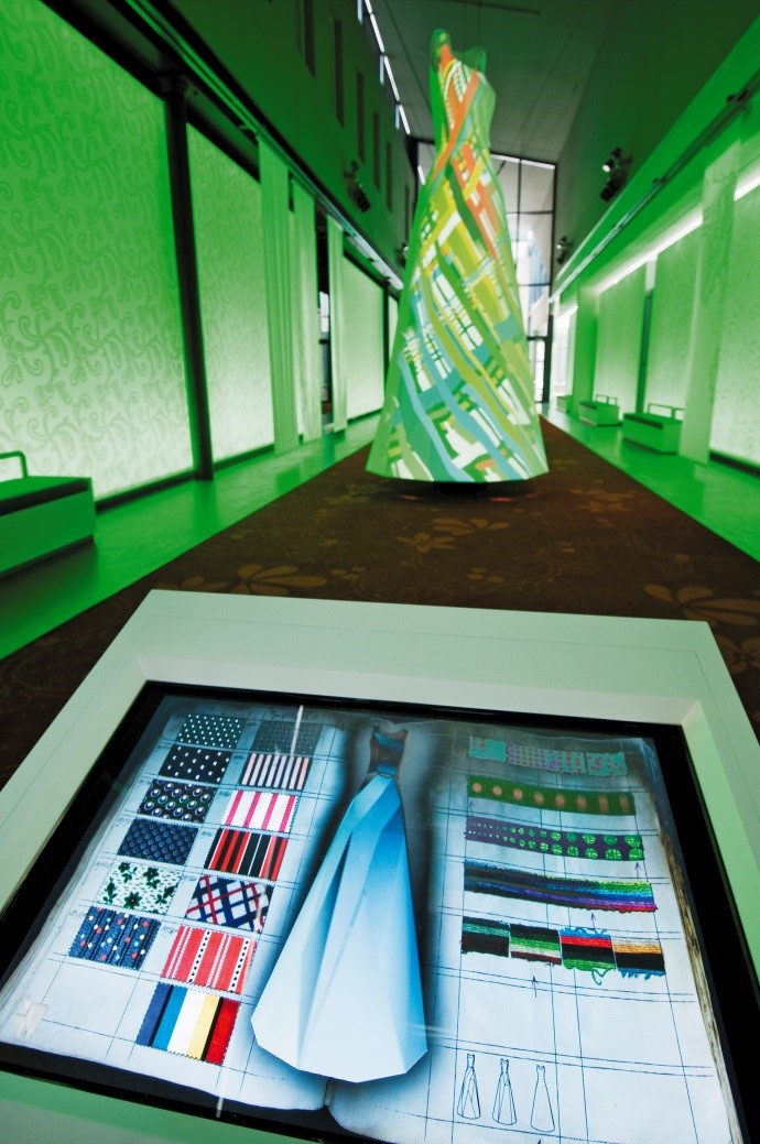 Hier lernt der Besucher weitere Webstühle kennen. Ein Highlight im Maschinensaal bildet die Sauerer Schützenwebmaschine, welche Stoffe mit Jacquardmuster produziert. Joseph Marie Jacquard (1752-1834) erfand 1805 in Frankreich einen Webstuhl, der es ermöglichte, komplizierte, bildgleiche Muster auf einer Fläche vollständig mechanisch zu weben. Dies war einer der ersten Schritte in der Wandlung des Gewebes vom Luxusartikel zum Massenprodukt. Der Weg in die Industrialisierung Beeindruckt von den Vorführungen im Maschinensaal wendet sich der Besucher der Historie der Textilverarbeitung zu. Erfolgte die Textilherstellung bis zur Industrialisierung vorwiegend in häuslicher Produktion, fertigten schon um 1500 Weber die entsprechenden Stoffe. In Zünften organisiert, erlangten die Weber rasch Einfluss und Bedeutung in der Augsburger Kaufmannschaft, was das heute noch in der Augsburger Innenstadt befindliche Weberhaus eindrücklich dokumentiert. Eng mit der stetig voranschreitenden Industrialisierung sind in der Augsburger Textilbearbeitung u.a. die Namen folgender Augsburger verbunden: - Georg Neuhofer (1660-1735): Einführung des Kattundrucks in Augsburg um 1700[5] - Johann Heinrich Edler von Schüle (1720-1811): Schüle´sche Kattunmanufaktur (erbaut 1770-1772), die berühmteste Manufaktur in Süddeutschland (beherbergt heute die Hochschule für Angewandte Wissenschaften Augsburg)[6] - Karl Forster (1788-1877): Erbauer der Kattundruckerei Schöppler&Hartmann (1885), die spätere NAK, in welcher die besagte Stoffmusterbuchsammlung entstanden ist.[7] - Ferdinand Benedikt von Schaezler (1795-1856): Verantwortete die Gründung der Mechanischen Baumwollspinnerei und Weberei in Augsburg SWA (1837), welches als das älteste Textilproduktionsunternehmen gilt. [8]Ihre Spuren findet man in Augsburg u.a. noch im Proviantbachquartier mit dem Alten Fabrikschloss, den anliegenden Arbeiterwohnungen und am Glaspalast. Neben dem Weben existiert das sogenannte Knitting, welches textile Flächen durch Stricken oder Wirken entstehen lässt. Das Museum beherbergt u.a. einen Rundstrickautomat zum Stricken von bspw. Socken, Strümpfen und Unterwäsche sowie eine Flachstrickmaschine für das Erzeugen von bspw. Pullover und Jacken. Die Musterbücher Bevor der Besucher in den Bereich der Textilveredelung gelangt, empfangen ihn drei überlebensgroße, mehrere Meter hohe „Grazien“ auf einem roten Teppich. Flankiert wird diese Raumeinheit, die als „begehbares Musterbucharchiv“[9] konzipiert ist, von der Stoffmusterbuchsammlung der NAK. Da jeweils nur Doppelseiten der Folianten zu besichtigen sind, kann der Besucher über ein Terminal Muster auswählen und dann auf eine der Grazien projizieren, wodurch je nach Muster ein neues Licht- und Farbkonzept die Ausstellungshalle belebt (s. Abb. 3). Musterbücher beinhalten Tuchproben, die als Gedächtnisstütze, aber auch als Inspirationsquelle dienen. 150 Musterbücher mit 1,3 Mio. Mustern dokumentieren die Muster- und Modeströmungen der letzten 200 Jahre.[10] Beeindruckt von der Vielfalt der Muster folgt der Besucher weiter dem textilen Prozess.